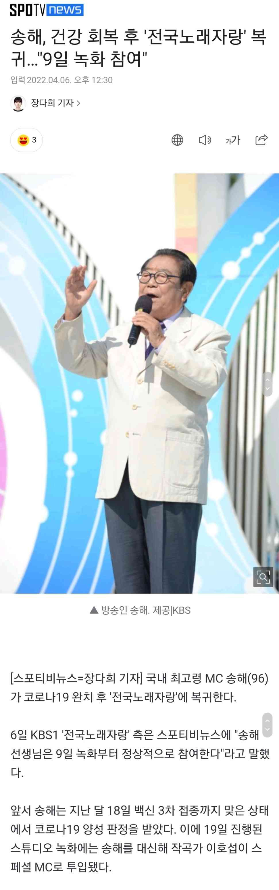 싱글벙글 송해 코로나 회복, 전국노래자랑 복귀.News