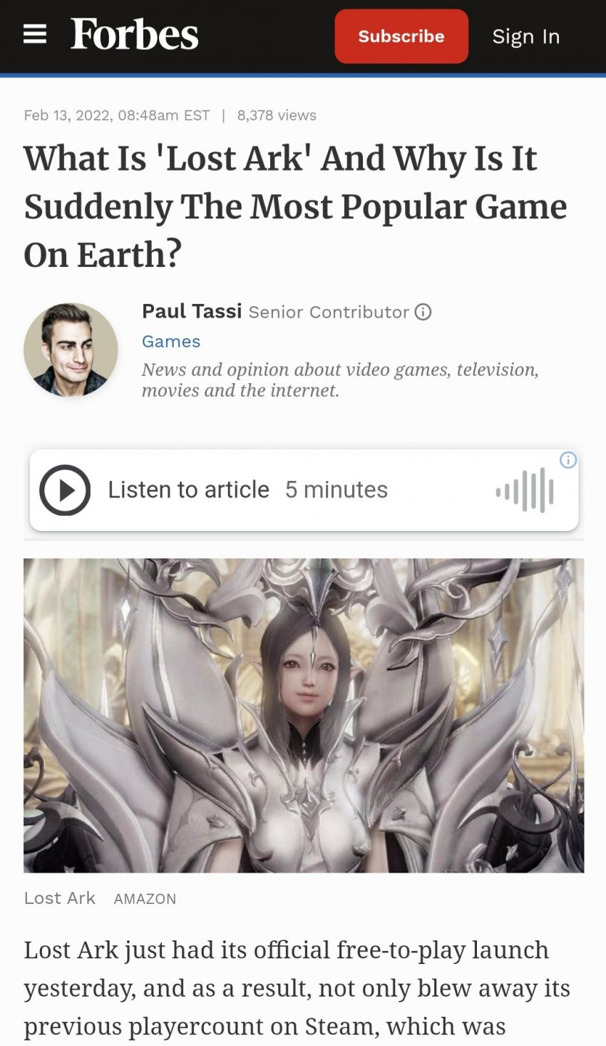 포브스선정) 지구에서 가장 인기있는 게임 로스트아크