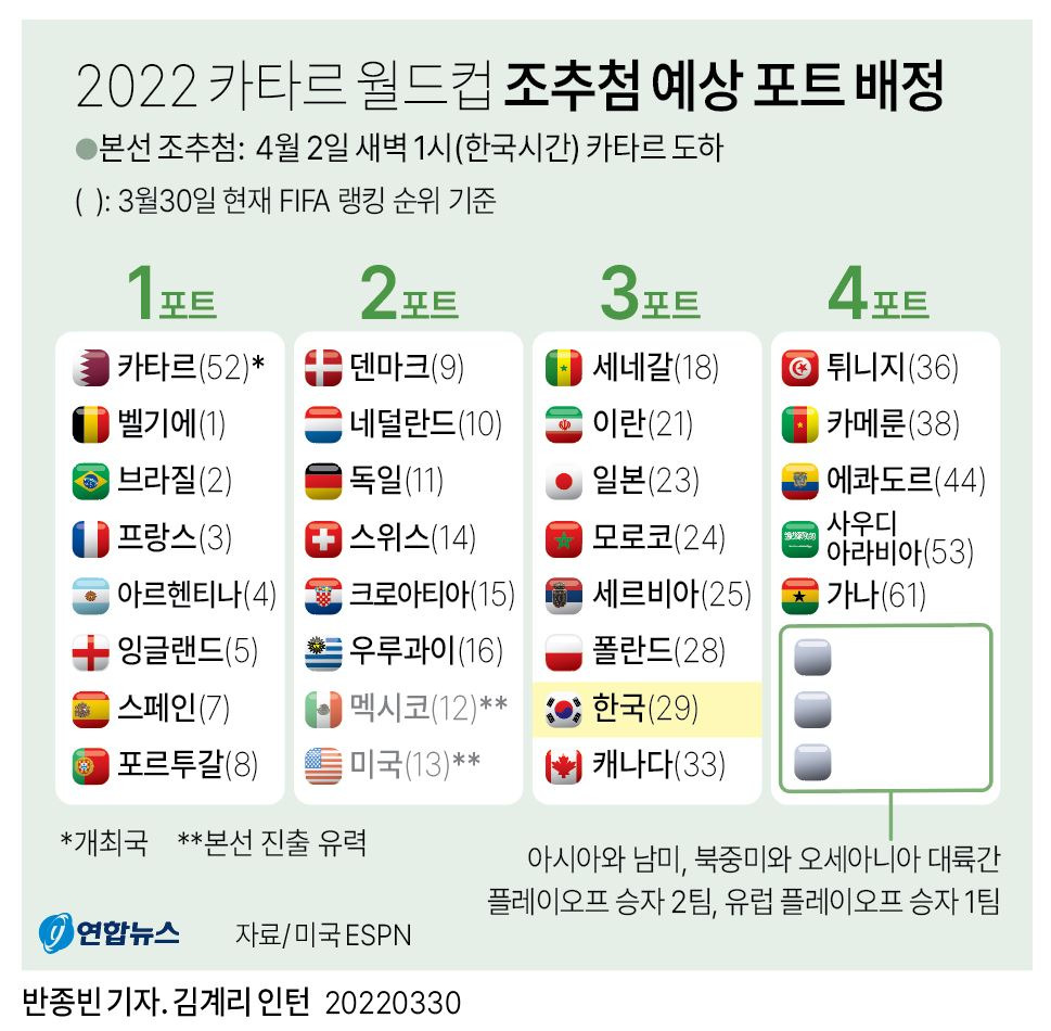 2022 카타르 월드컵 조추첨 예상 포트 배정