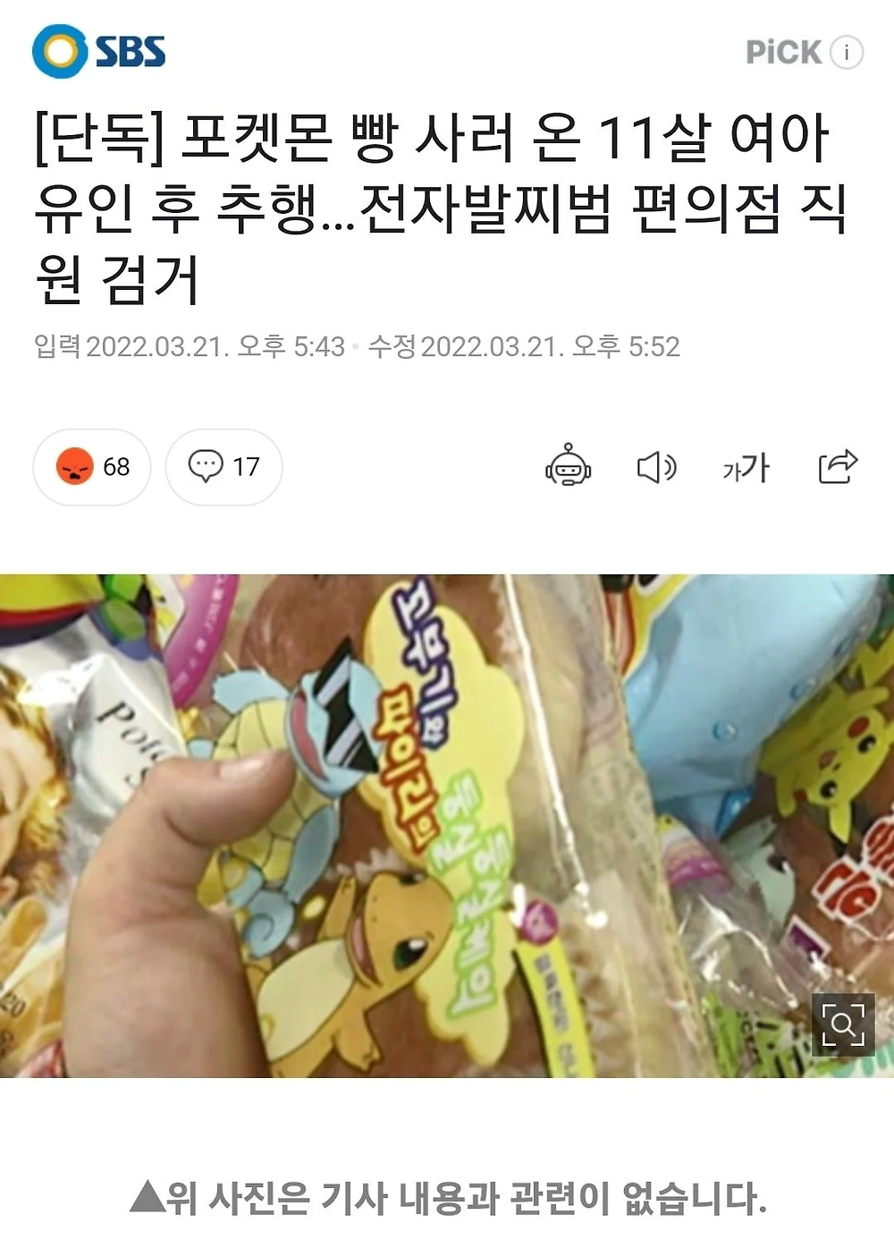 포켓몬빵 사러 온 11살 여아 유인 후 추행.. 편의점 직원 체포