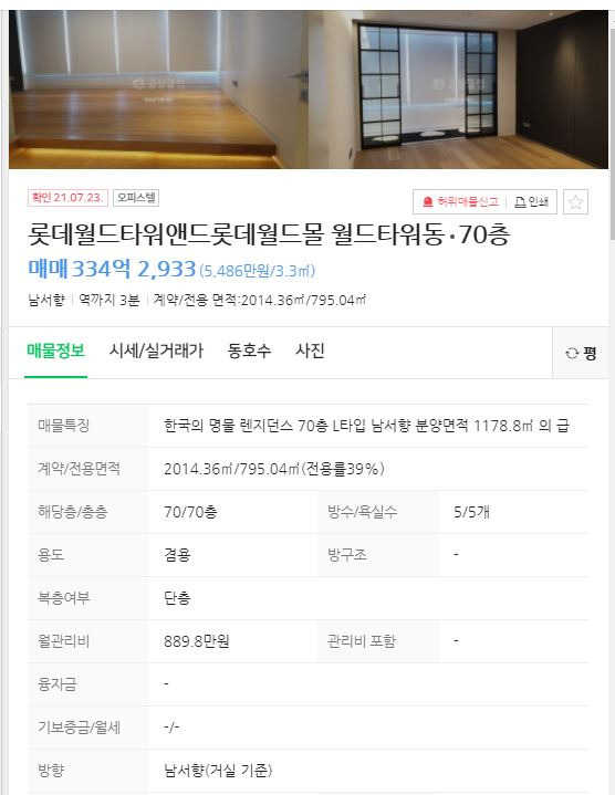 롯데월드타워 꼭데기층 매물 나왔네요.