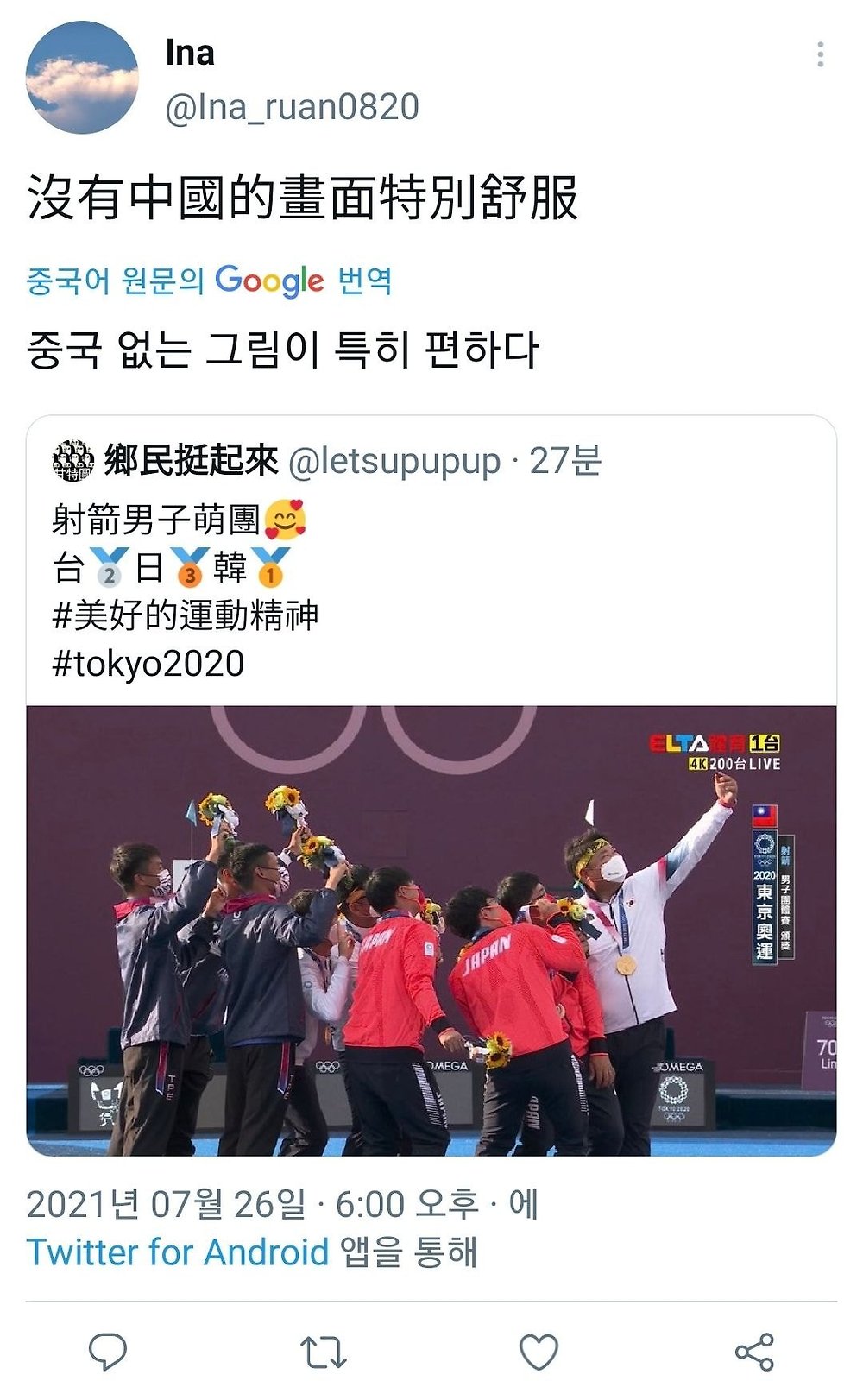 양궁 시상식 셀카 대만인 반응