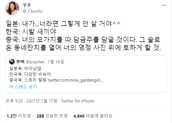 한국, 중국, 일본 욕 특징