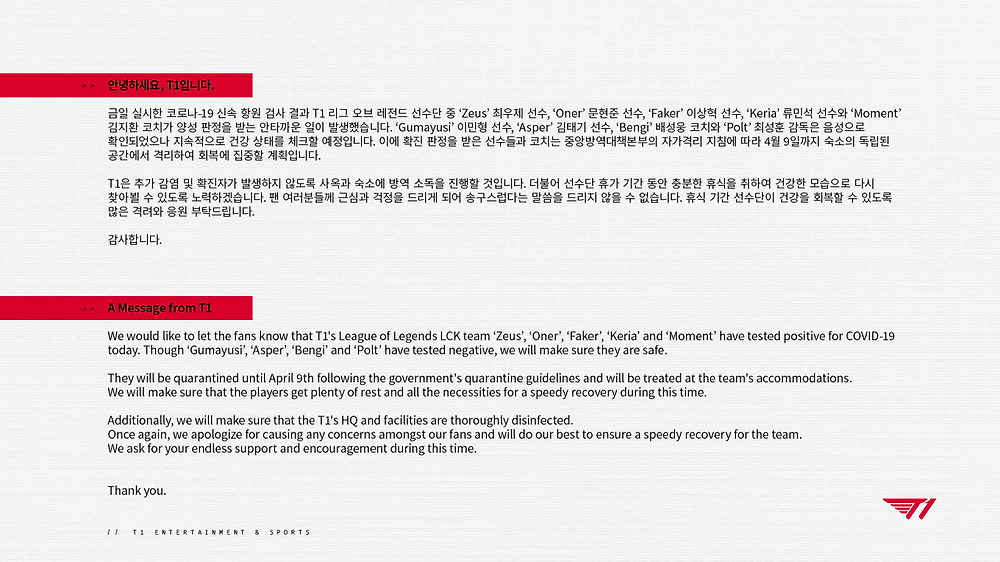 lck T1 선수들 단체로 코로나 확진