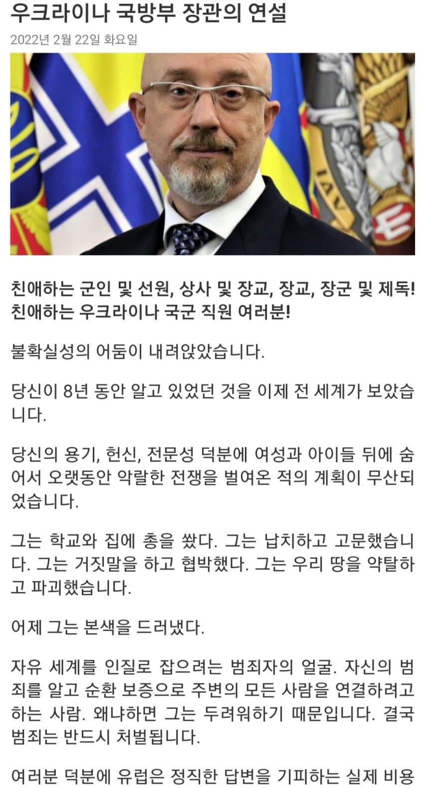 [속보] 우크라이나 국방부 장관 연설문