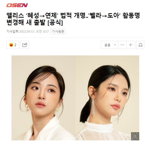 앨리스 ‘혜성->연제’ 법적 개명..'벨라->도아' 활동명 변경해 새 출발