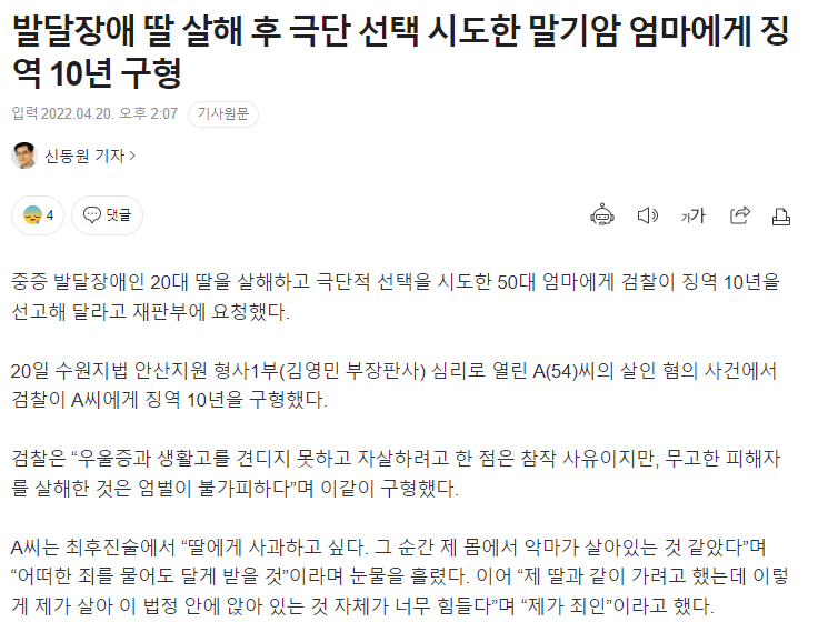 발달장애 딸 살해 후 극단 선택 시도한 말기암 엄마