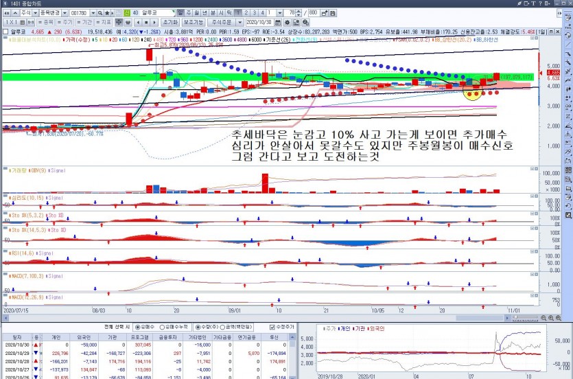 주봉월봉이 매수신호면 과감히 5~10% 선매수 들어가고 지지받고 양선 그리도 다음날도 상승 매수신호를 보낼적에는