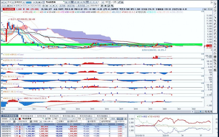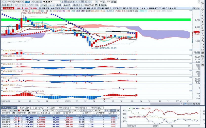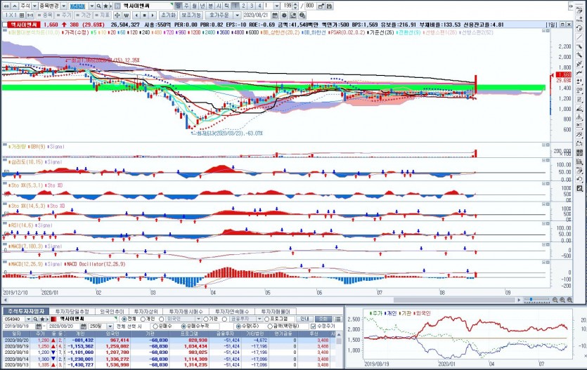 주봉 20주선 위에서 십자전환 신호후 이번주 20주선 살짝 이탈하는듯하다가 냅다 상한가